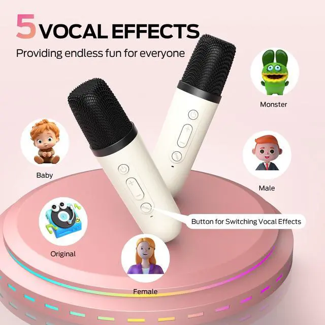 5 MAGIC VOICE : Monster karaoke machine features 5 magical sound effects: Original, Baby, Female, Male and Magician. Press the sound effects button to quickly switch between different sound effects, bring fun and excitement to the karaoke party, create a relaxing atmosphere for children and stimulate their imagination.