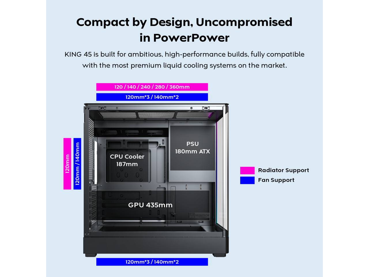 - The Montech King 45 is a full-sized ATX case designed for maximum airflow and versatile hardware compatibility. With a tempered glass side panel, multiple fan and radiator support, and ample interior space, it allows for high-performance builds with easy cable management. Ideal for gamers and PC enthusiasts who want both style and functionality in a robust chassis.