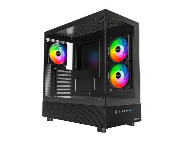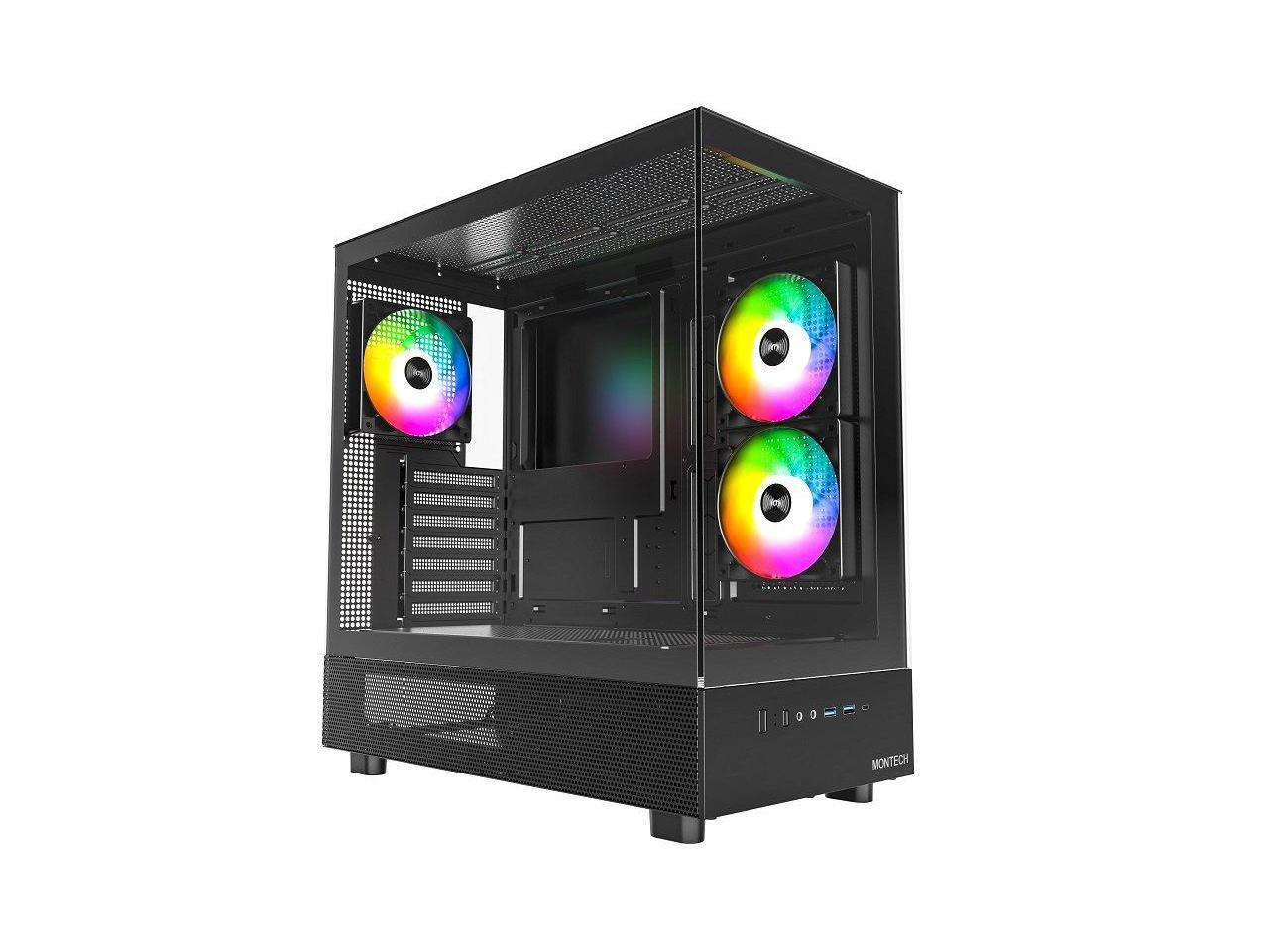 MONTECH XR, ATX Mid-Tower PC Gaming Case, 3 x 120mm ARGB PWM Fans Pre-Installed, Full-View Dual Tempered Glass Panel, Wood-Grain Design I/O Interface, Support 4090 GPUs, 360mm Radiator Support, Black