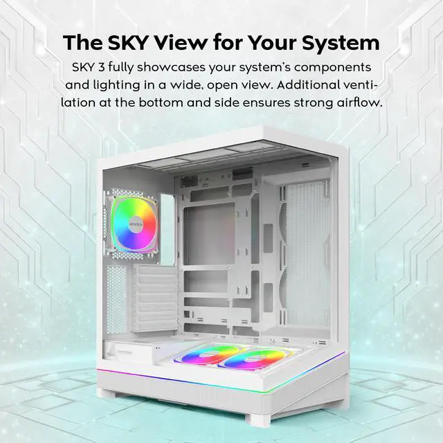- The SKY View for Your System: With panoramic glass panels across the front and side, the SKY 3 fully showcases your system's components and lighting in a wide, open view.