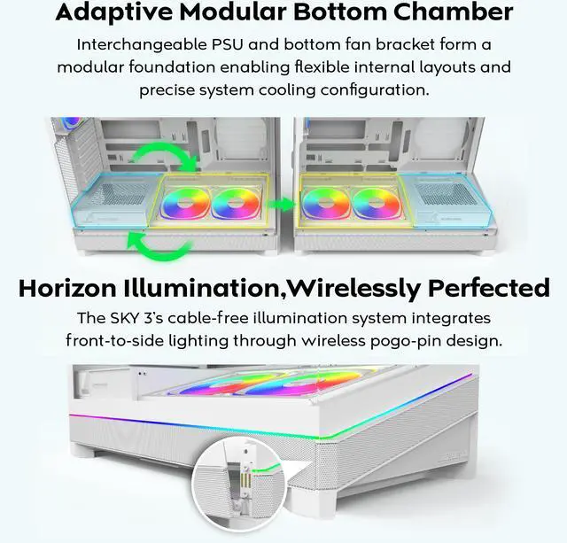 - Adaptive Modular Bottom Chamber: Interchangeable PSU and bottom fan bracket form a modular foundation enabling flexible internal layouts and precise system cooling configuration.