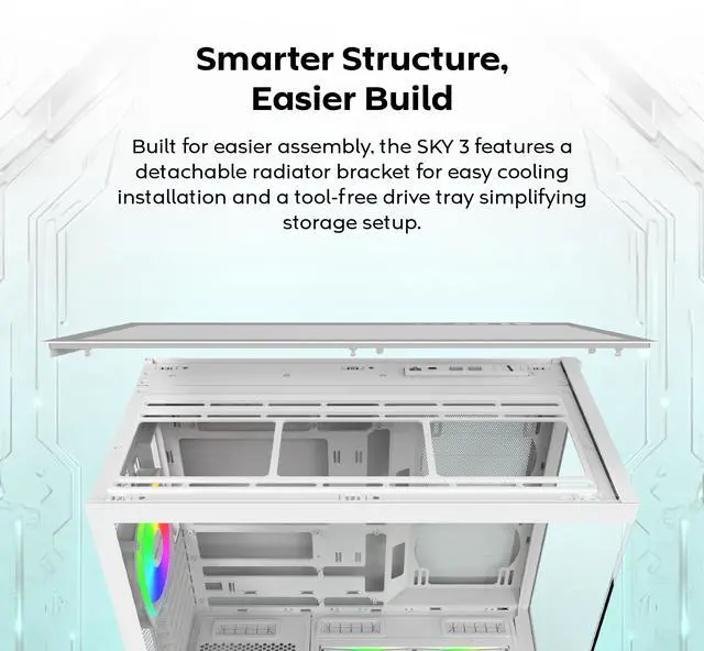 - Smarter Structure, Easier Build: Built for effortless PC building, the SKY 3 features a detachable radiator bracket and a tool-free drive tray, with support for ATX, M-ATX, and ITX motherboards.