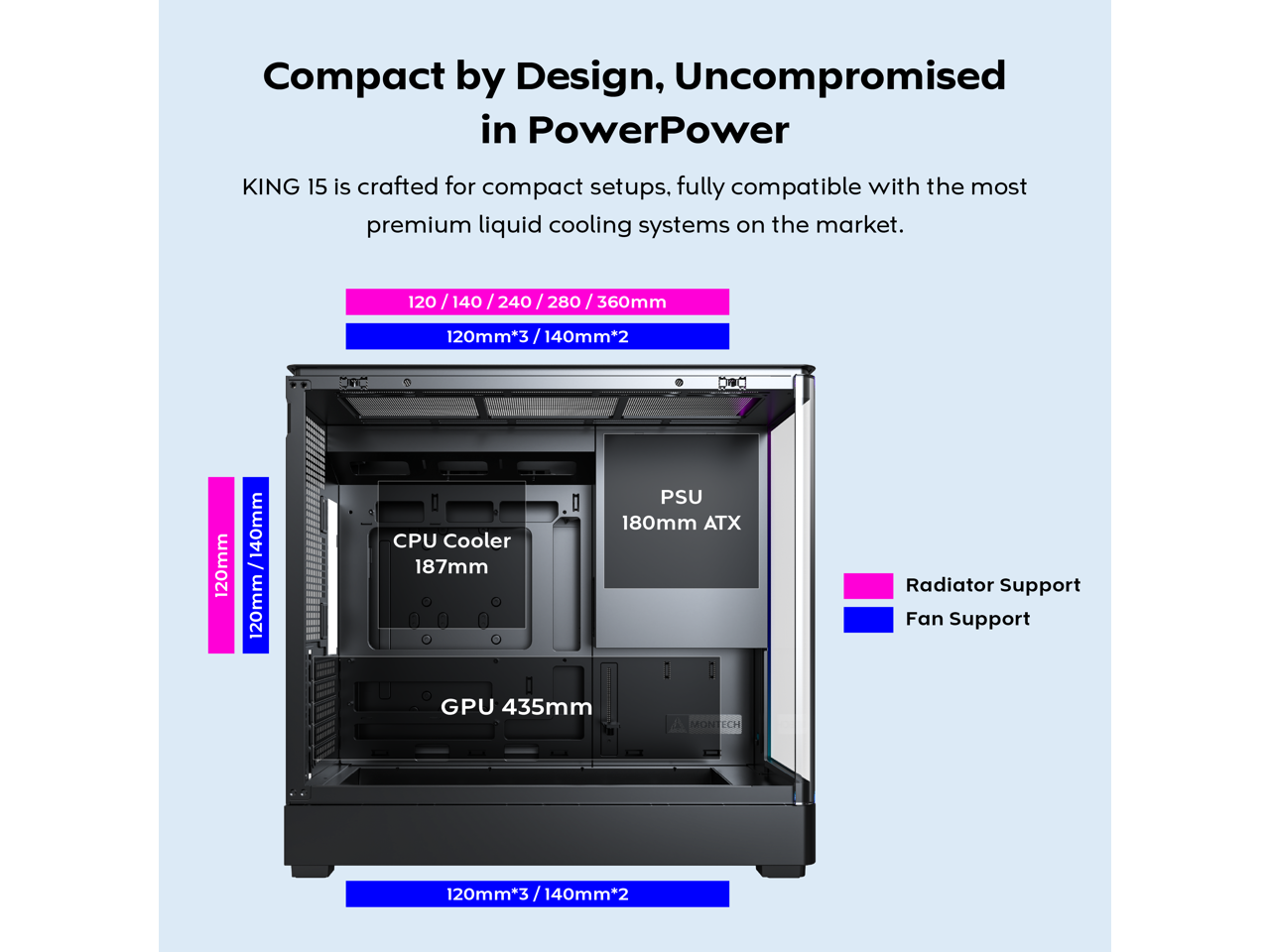 The Montech King 15 is a sleek Micro ATX case designed for efficient airflow and easy installation. Featuring a tempered glass side panel and optimized interior layout, it supports a variety of cooling solutions, including multiple fan and radiator configurations. Perfect for gamers and PC enthusiasts seeking a compact yet versatile case for their builds.