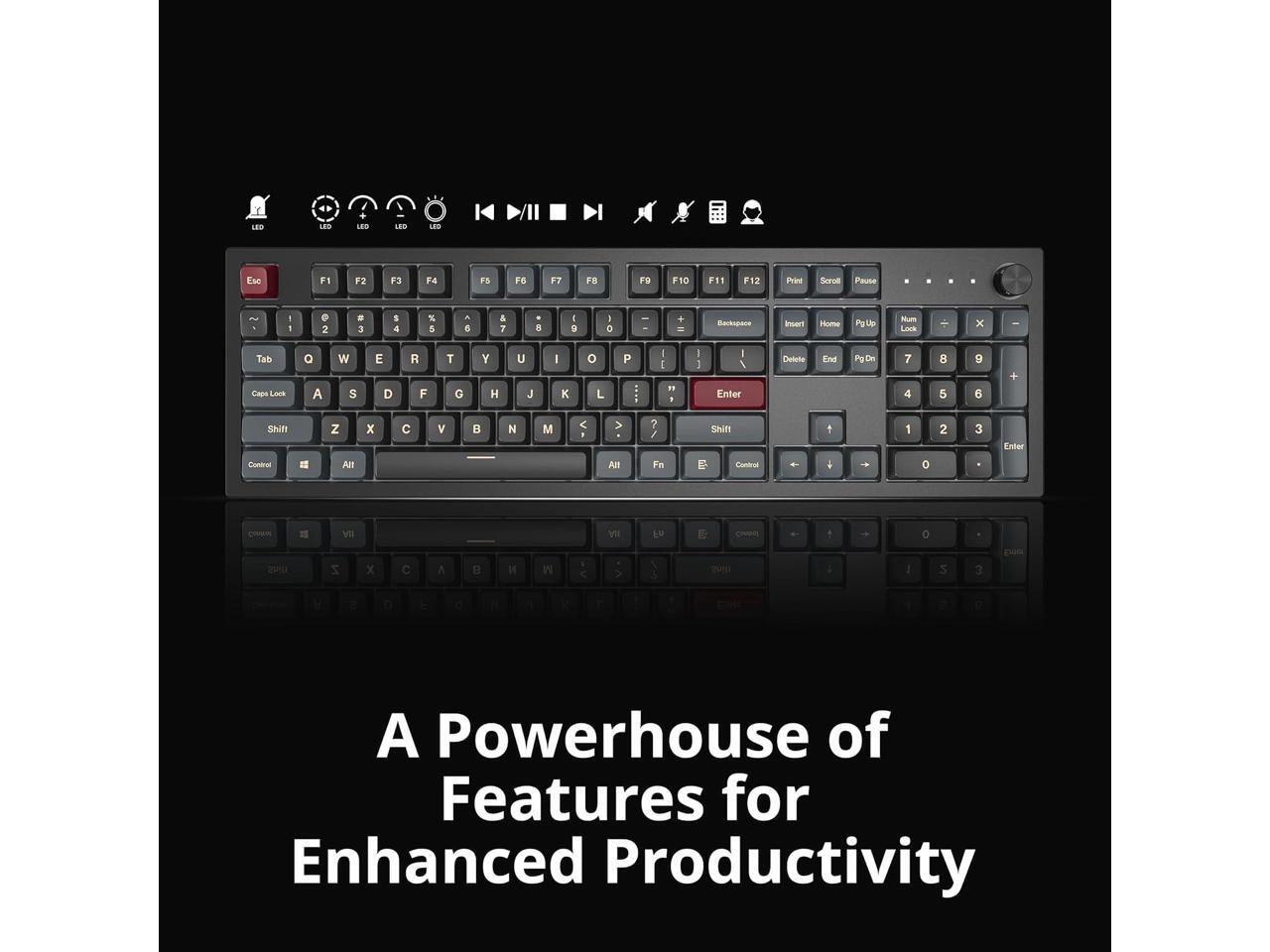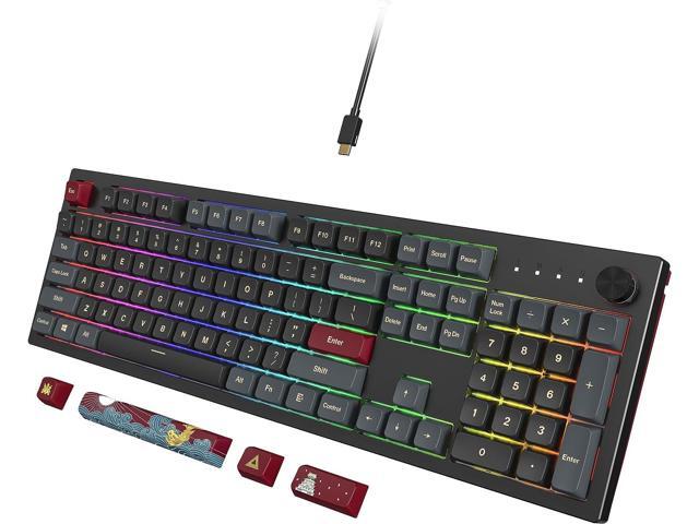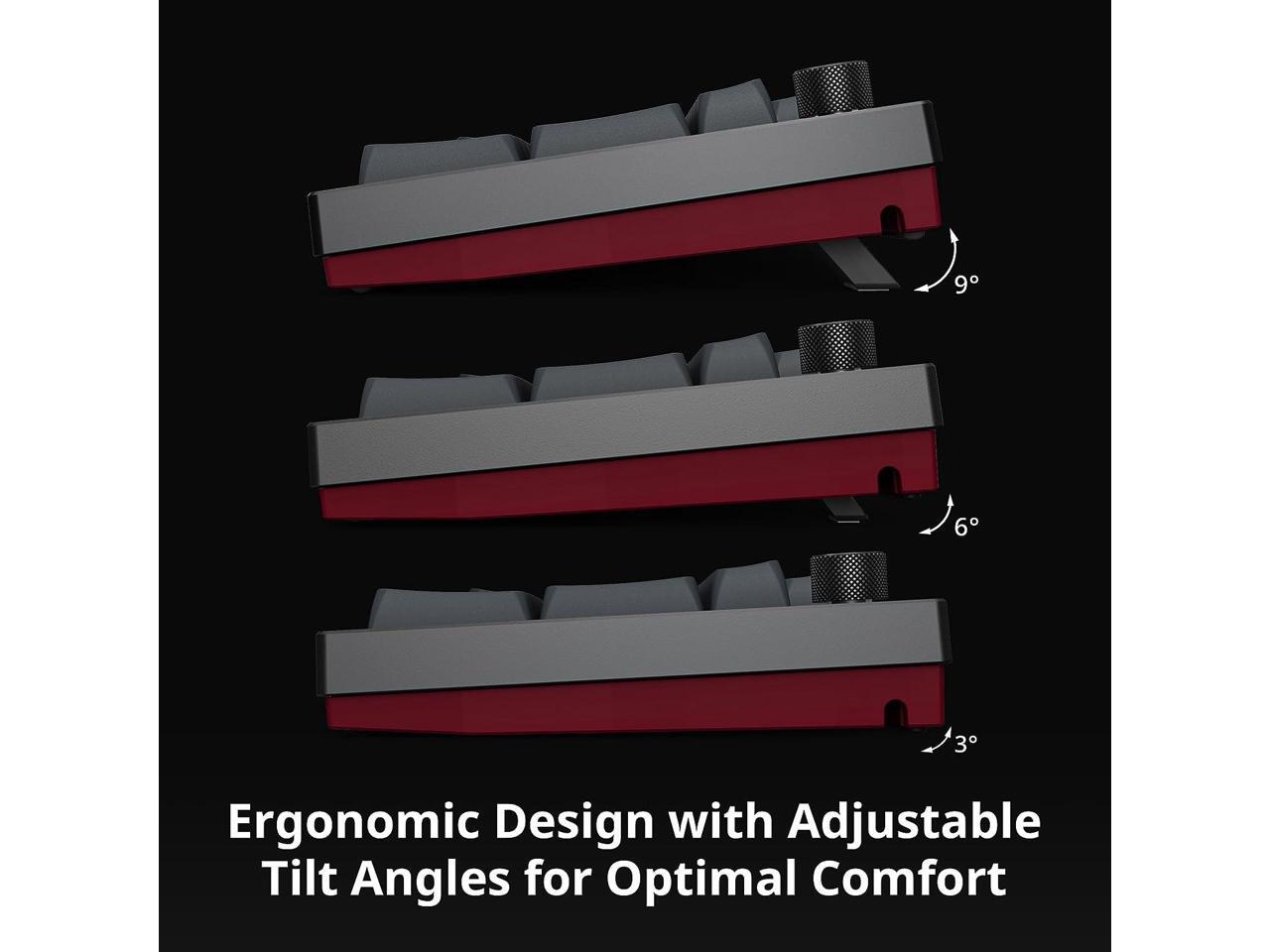 - Superior Features and Functions: Including RGB lighting, a multi-functional rotary knob, and three-level tilt adjustments (3°, 6°, and 9°) for comfortable typing ergonomics.