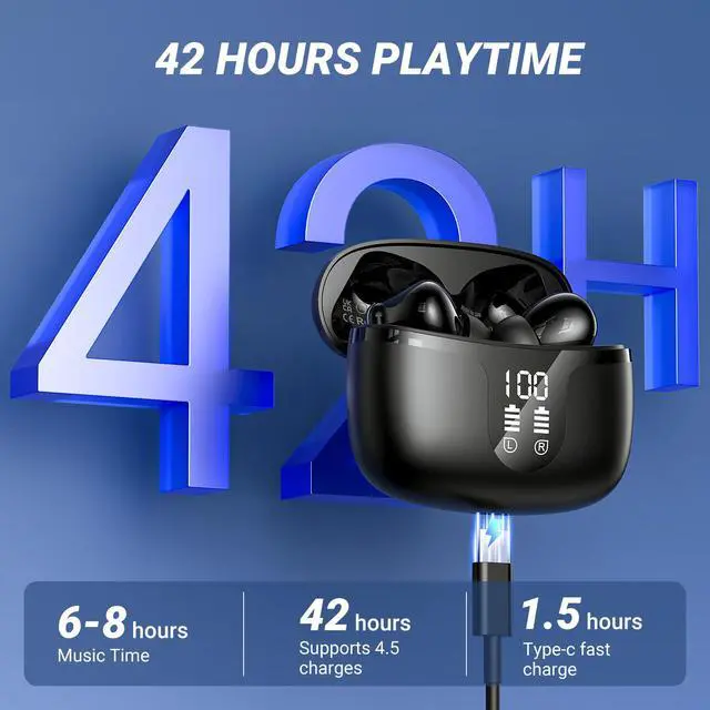 Wireless Earbuds Bluetooth 5.4 Headphones HiFi Stereo 42H Playback in Ear with 4 ENC Noise Cancelling Mic, IPX7 waterproof and LED battery display screen for Running Fitness Office Ear Buds in Black