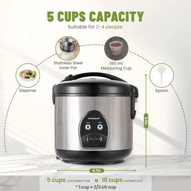 5-Cup Uncooked Rice Cooker, Electric One-Touch for Asian Japanese Sushi, Stainless Steel Inner Pot with Removable Lid & Steamer, Automatic Keep Warm, Silver
