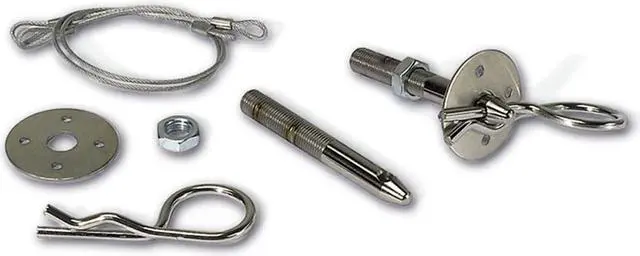 Oval Track Hood Pin Set L-3 in. 5 in. Dia. Chrome Plated Steel Pins 1.5 in. Dia. Stainless Steel Scuff Plates Vinyl Coated Stainless Steel Lanyards 2 Per Set