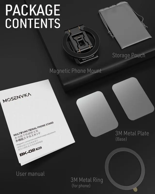 The MOSENVKA Dual-Sided Magnetic Phone Holder is more than just a stand; it's your all-in-one mounting solution for home, office, car, gym, travel, and beyond! Enjoy secure, flexible, and convenient phone viewing anywhere there's metal (or with our included plates, anywhere at all!)