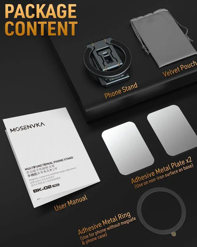 The MOSENVKA Dual-Sided Magnetic Phone Holder is more than just a stand; it's your all-in-one mounting solution for home, office, car, gym, travel, and beyond! Enjoy secure, flexible, and convenient phone viewing anywhere there's metal (or with our included plates, anywhere at all!)