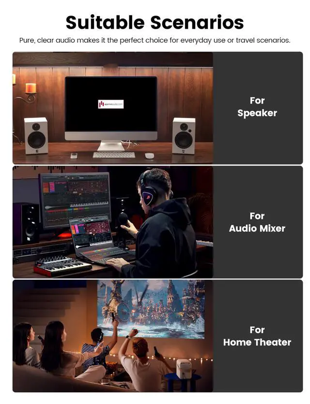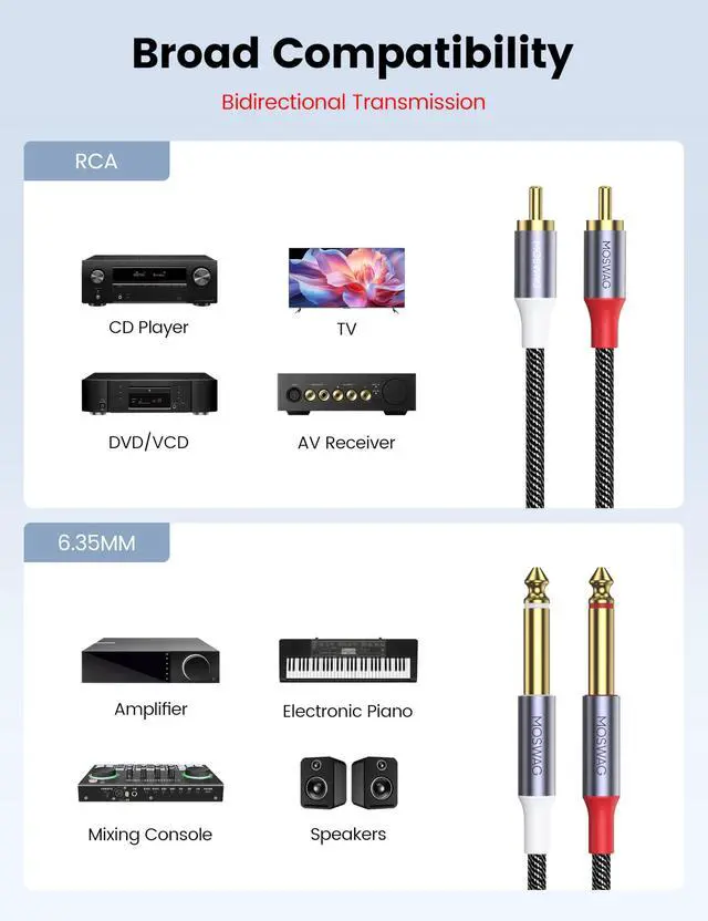 MOSWAG dual RCA to dual 1/4 cable is suitable for connecting devices with a 6.35mm audio interface to devices with RCA functionality. It can precisely transmit high-bandwidth frequencies, delivering pure and natural audio sound effects without jitter, making it ideal for music enthusiasts