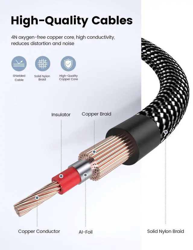 The 24K gold-plated connector is paired with multiple internal shields to provide optimal signal transmission and corrosion resistance. Dual 1/4 inch TS to dual RCA cable features a high-quality copper core and supports bidirectional transmission, while the solid nylon braiding ensures durability