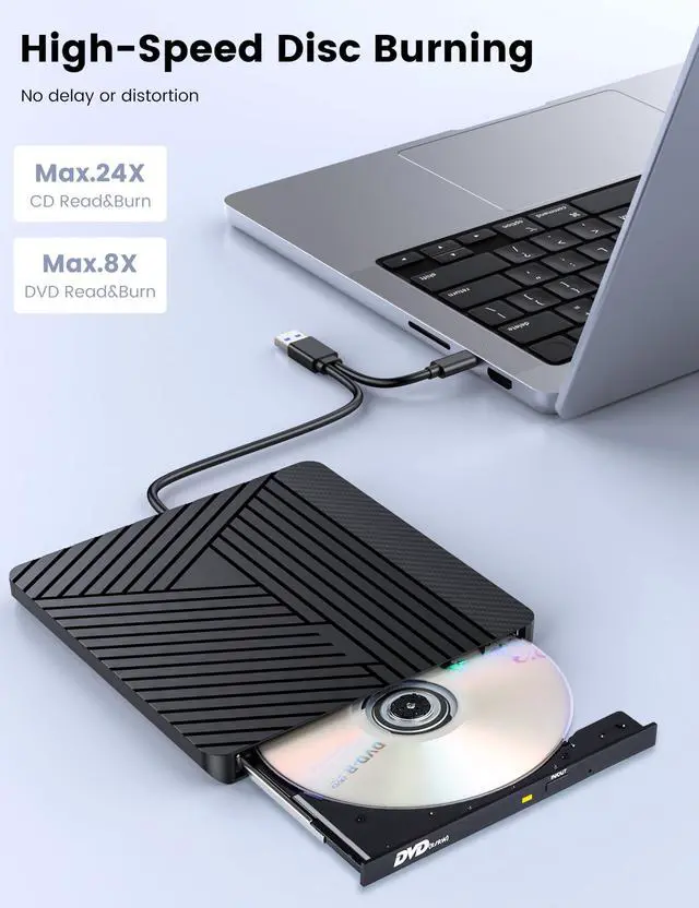 Extremely High Read and Write Speeds: The USB dvd drive adopts advanced burning technology, it supports a maximum writing speed of 8x for DVD-R and 24x for CD.