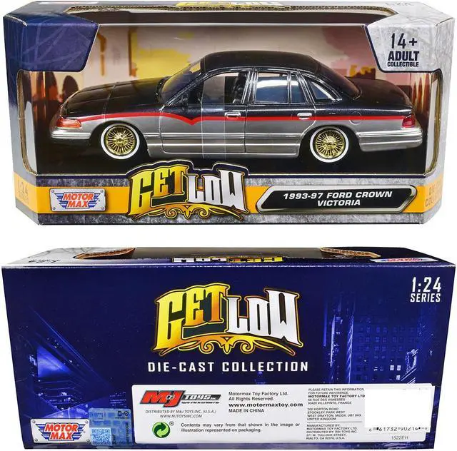 Brand new 1/24 scale diecast car model of 1993-1997 Ford Crown Victoria Lowrider Black Metallic and Silver with Red Stripes "Get Low" Series die cast model car by Motormax.