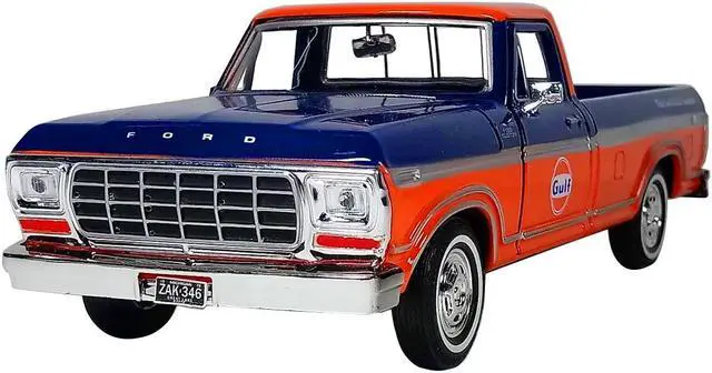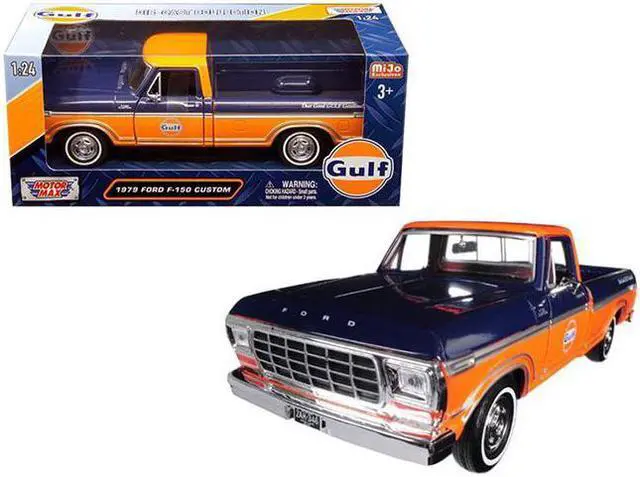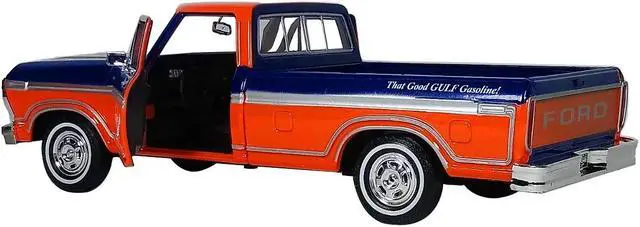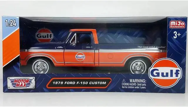 Brand new 1:24 scale diecast car model of 1979 Ford F-150 Custom Pickup Truck "Gulf" Dark Blue and Orange die cast car by Motormax.