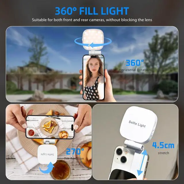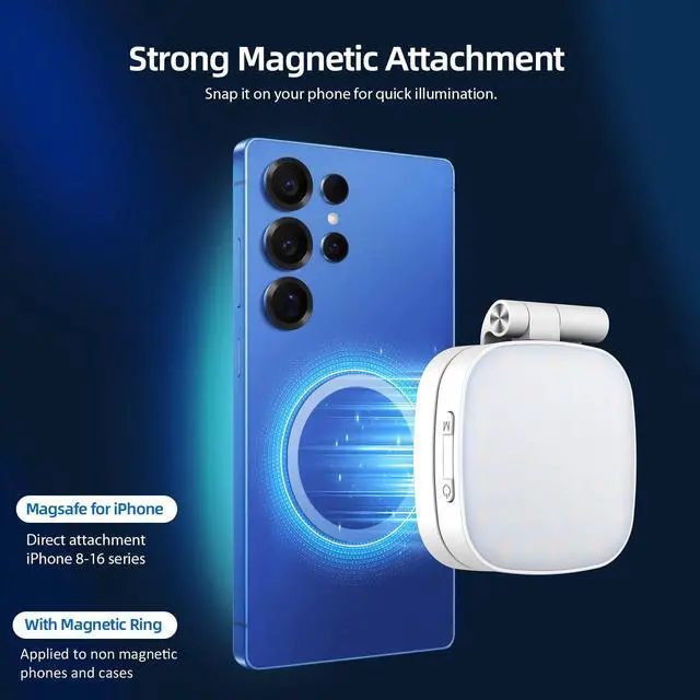 MAGNETIC SELFIE LIGHT WITH ADJUSTABLE ANGLES The FJHEPERPOO mini fill ring light is compatible for MagSafe, with strong magnetic force to firmly attach to magnetic phones, compatible for iPhone 17 Pro Max/ 16 Pro Max Plus 15/14/13/12 Mini iPad Pro Samsung Galaxy S24 S23 Ultra. For nonmagnetic devices, apply the included adhesive magnetic ring accessory to easily set up on Android phones, laptops. Supports 360° horizontal rotation and 270° vertical tilt and extends upwards to adjust to the desired lighting angle.