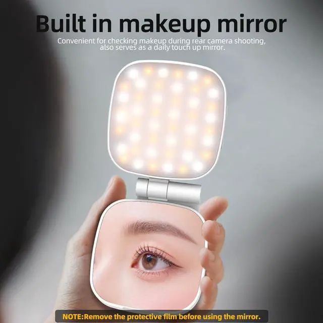 MAGNETIC SELFIE LIGHT WITH FULL-SIZE HD MAKEUP MIRROR With Full-size HD makeup mirror, FJHEPERPOO is an economical product line that focuses on essential functions and designs, without unnecessary extras and materials. The FJHEPERPOO photo light for photography is an ultra compact & portable phone selfie lighting, featuring 45 premium LEDs that provide 700lx/0.3m with a high CRI of 95+. It brightens your skin and reduces facial blemishes, helping you look your best on camera. Note: Peel off the protective film before using the mirror.