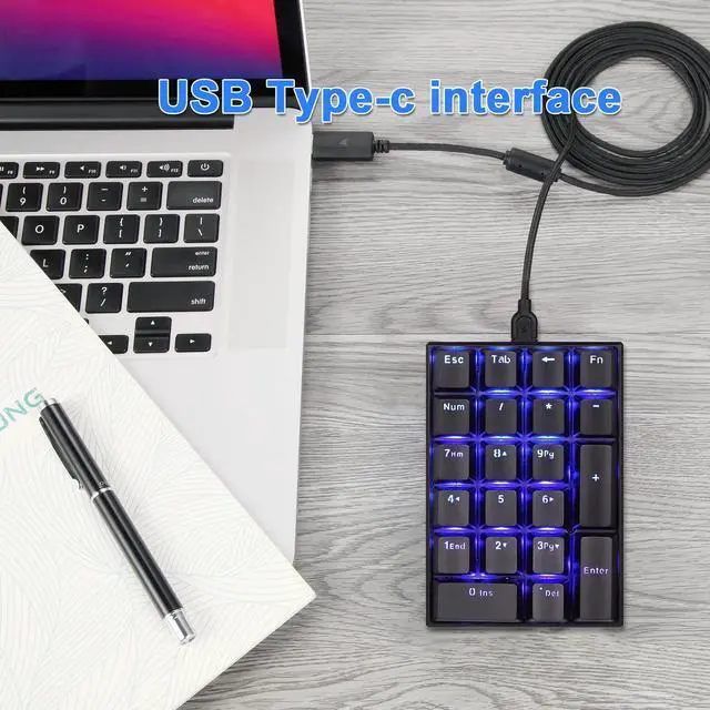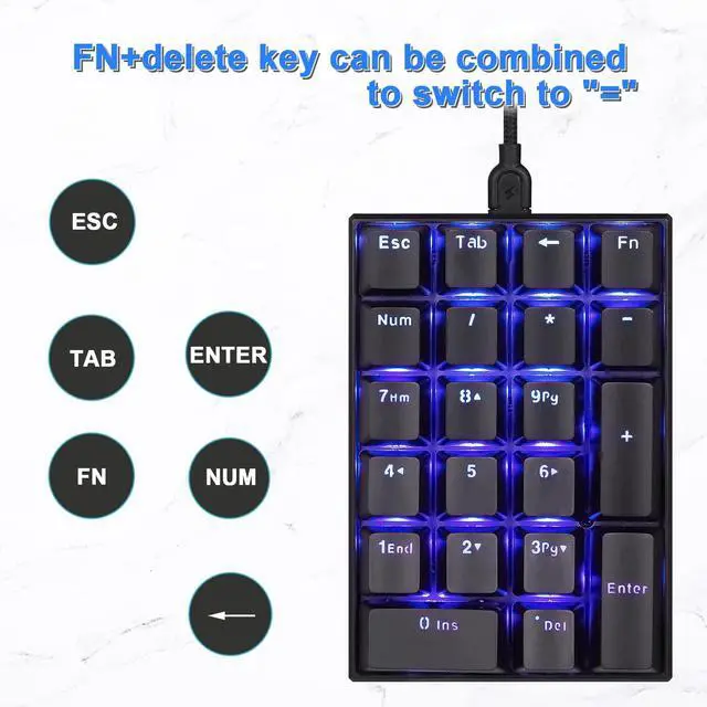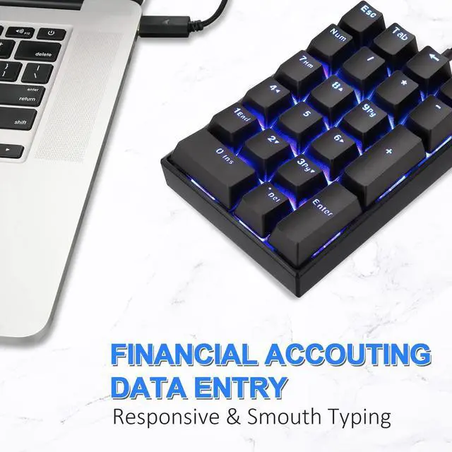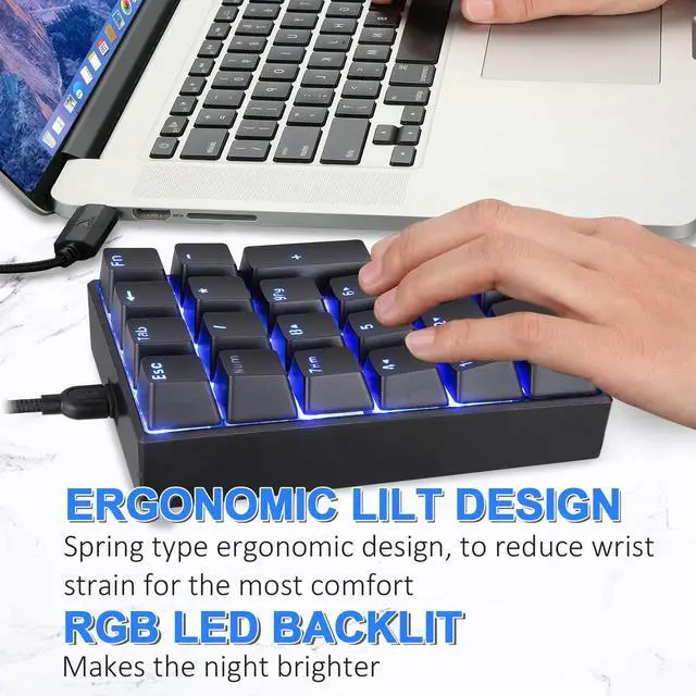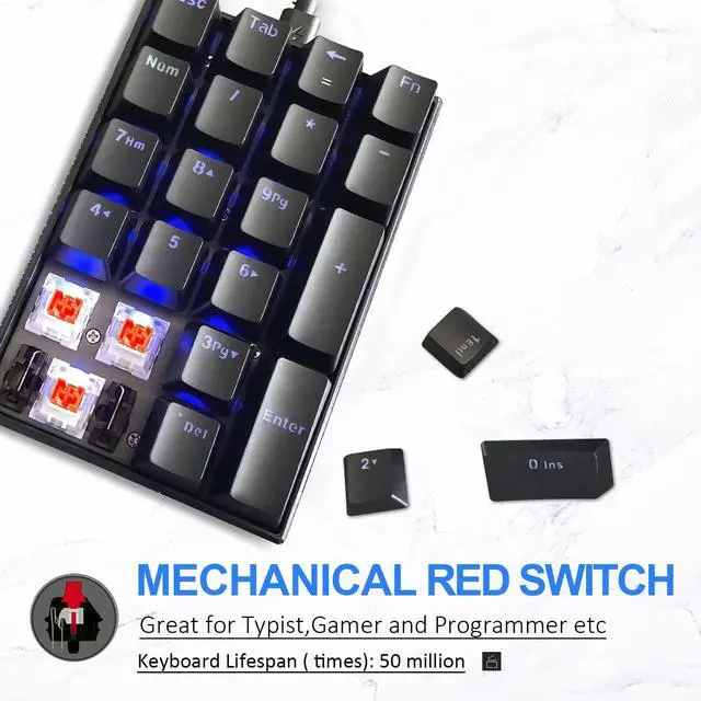 The number locking function is independent of any other keyboard that are currently connected.Advanced mechanical switch is superior to water resistant, rustproof and 50 million clicking life. Compare with the other standard keypad, the 21 keys extended some buttons at the top, contain ESC, Tab, back, calculator.