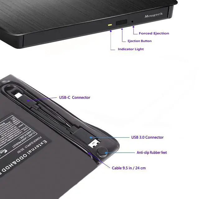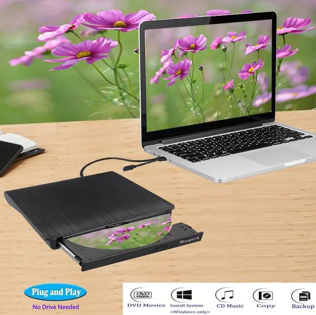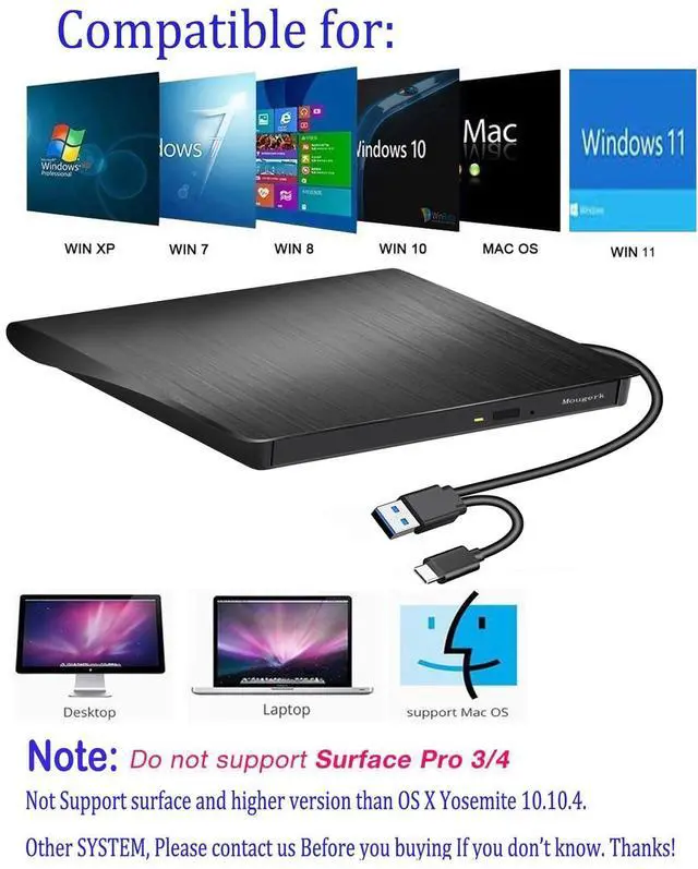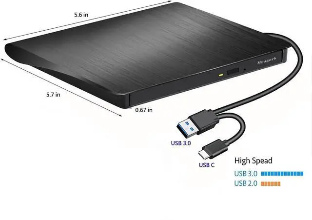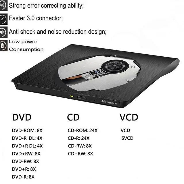 Mougerk provide slim portable fast USB3.0 CD/DVD burner, you can watch DVD movies, burn files, movies to a CD/DVD, install software and create backup discs etc. Compatible with Windows 10 / 8 / 7 / XP, Linux, system and Mac10 OS system.