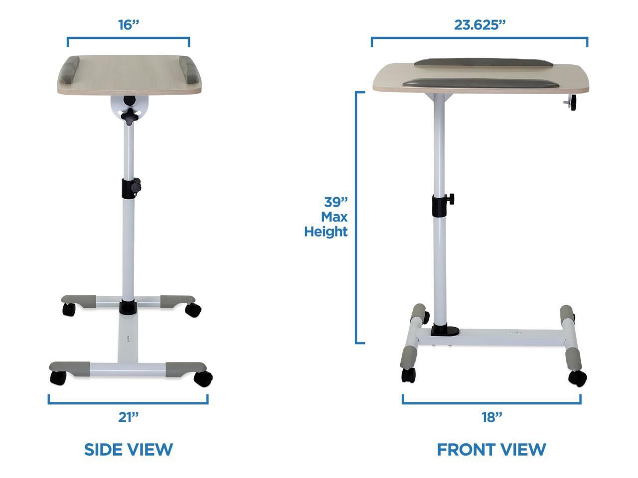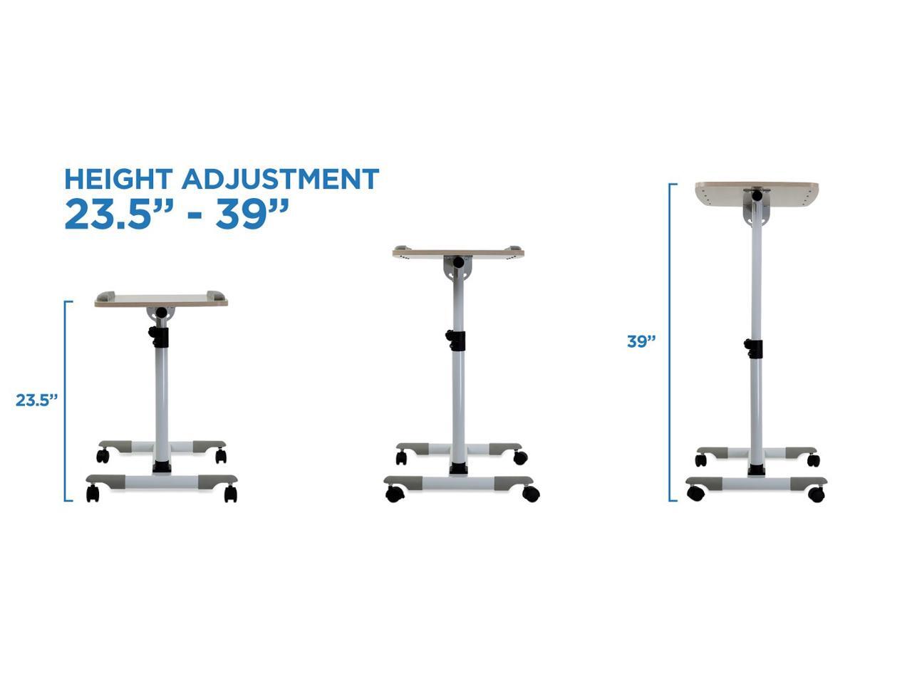 - ADJUSTABLE HEIGHT ROLLING DESK - Lift and lower the height of the desk for sitting or standing use. Height adjusts between 23.5 to 39 inches.