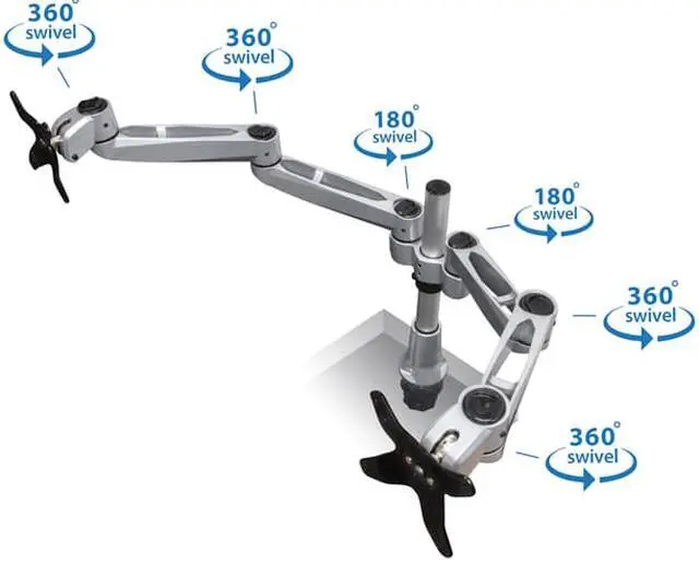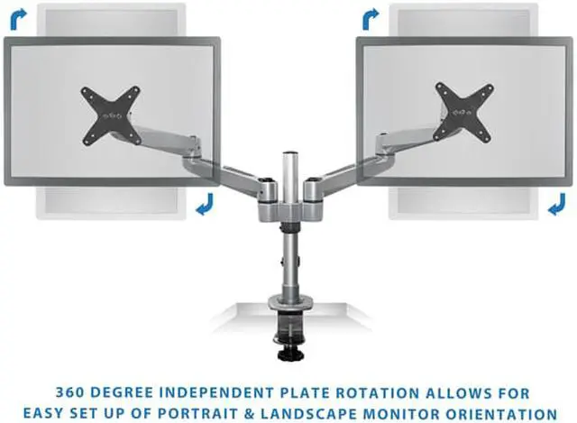 The dual monitor mount features two full motion arms to create a more customized workspace. The extra long mounting pole measures 20.5 , allowing for a large height adjustment range. From height adjustment, to monitor tilt, swivel and rotation, this monitor desk mount is designed to maximize the users efficiency and comfort. Boost productivity and enhance workflow with double the screen space, while improving posture and clearing up more desk space by elevating the monitors. This premium dual monitor mount is fully TAA (Trade Agreements Act) compliant and is suited for purchase by the U.
