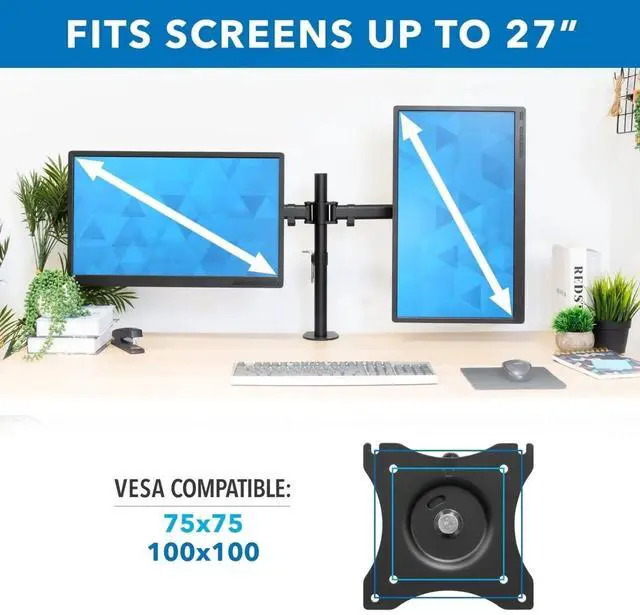 Make your workspace more dynamic and ergonomic with the MI-1752 Height Adjustable Full-Motion Desk Mount, designed to securely hold two monitors ranging from 13 to 27 inches. This robust and durable mount is universally compatible with a wide array of monitor brands including Samsung, Dell, HP, Viewsonic, AOC, Asus, Acer, LG, and eMachines, ensuring a perfect fit for your existing equipment. Crafted to support VESA standards, the MI-1752 accommodates both 75x75 mm and 100x100 mm patterns, which are the common square bolt hole configurations found on the back of most monitors.