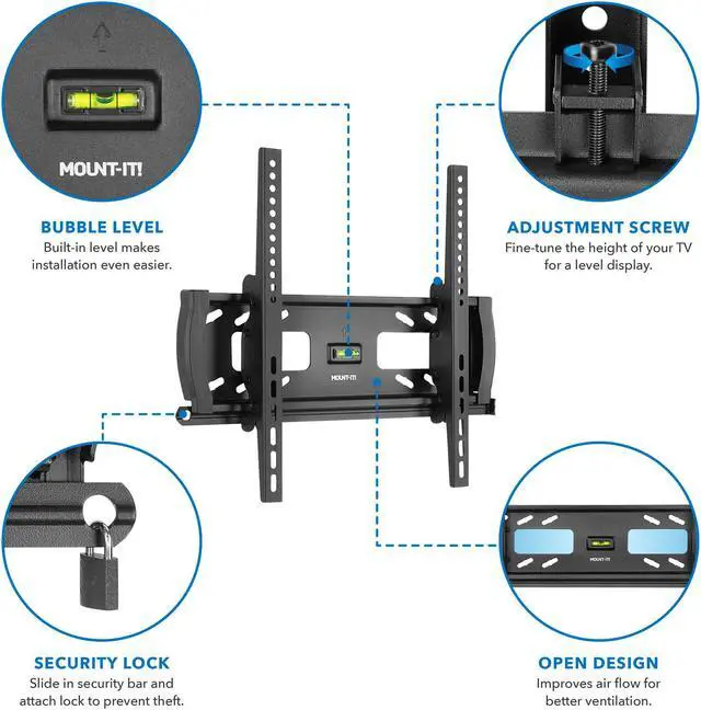 The Mount-It! Anti-Theft Tilt TV Wall Mount is all about strength, safety, and security. The padlock compatible sliding bar secures the arm brackets to the wall plate to prevent removal of the TV. The added tilt feature allows you to find the optimal viewing angle while reducing glare. It's also UL Certified, can hold up to 99 pounds, and makes an excellent choice for use in public spaces such as hotels, schools, offices, and restaurants.
