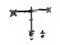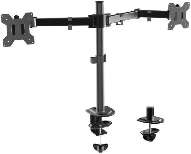 Constructed of heavy duty steel, integrated cable management clips keep your cables organized, comes with interchangeable C-clamp or grommet bases, and mounting plates are detachable for easy monitor mounting. bullet-point.
