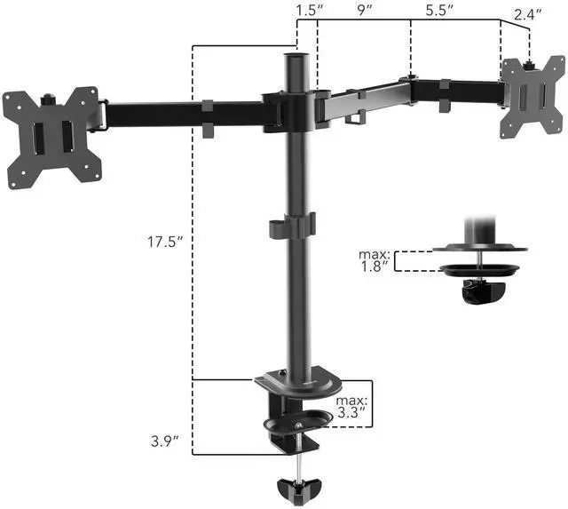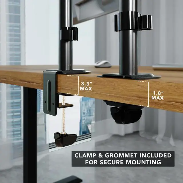 Choose the mounting option that works for you. The clamp mount fits desktops up to 3.5 inches thick. The grommet mount fits desktops up to 4 inches thick.