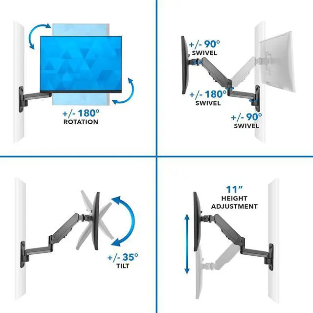 Single VESA wall mount can tilt, swivel, raise and/lower - and screen has 360 degree rotation. Turn hex bolt on top of computer monitor arm to adjust the gas spring tension to hold screens in place.