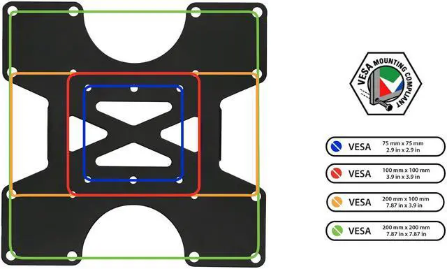 - Four VESA sizes: 2.9" x 2.9"; 3.9" x 3.9"; 7.87" x 3.9"; 7.87" x 7.87".