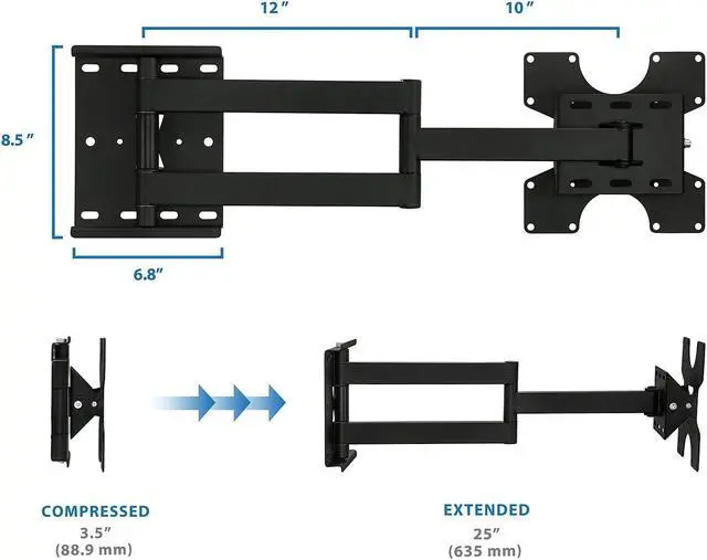 - Compressed dimensions: 3.5"; extended dimensions: 25"; wall-plate dimensions: 6.8" x 8.5".