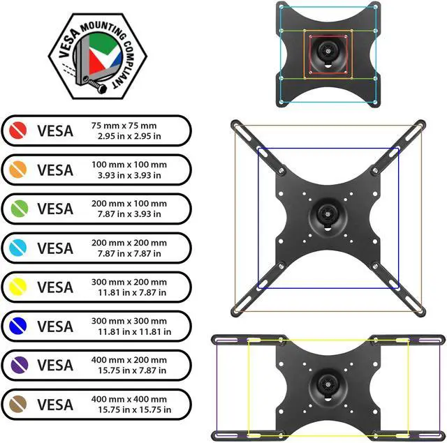 - VESA compatibility: 75x75, 100x100, 200x100, 200x200, 300x200, 300x300, 400x200, 400x400 (mm); compatible screen size: 23" to 42"; max weight capacity: 44 lbs.