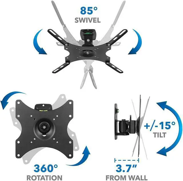 This full-motion locking TV mount features a removable VESA plate for easy installation and works great as an outdoor TV mount, allowing you to bring your TV indoors at night. The single-stud installation and integrated bubblehead is purposely designed to make mounting your TV a breeze. Rotate this mount to get the perfect view of your screen and enjoy its 360-degree rotation ability as well as its swivel and tilt abilities.