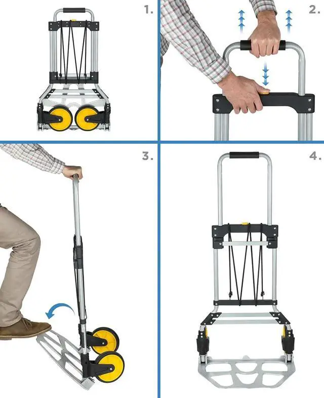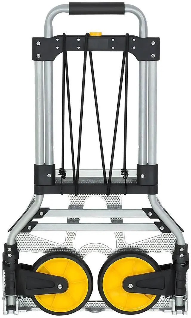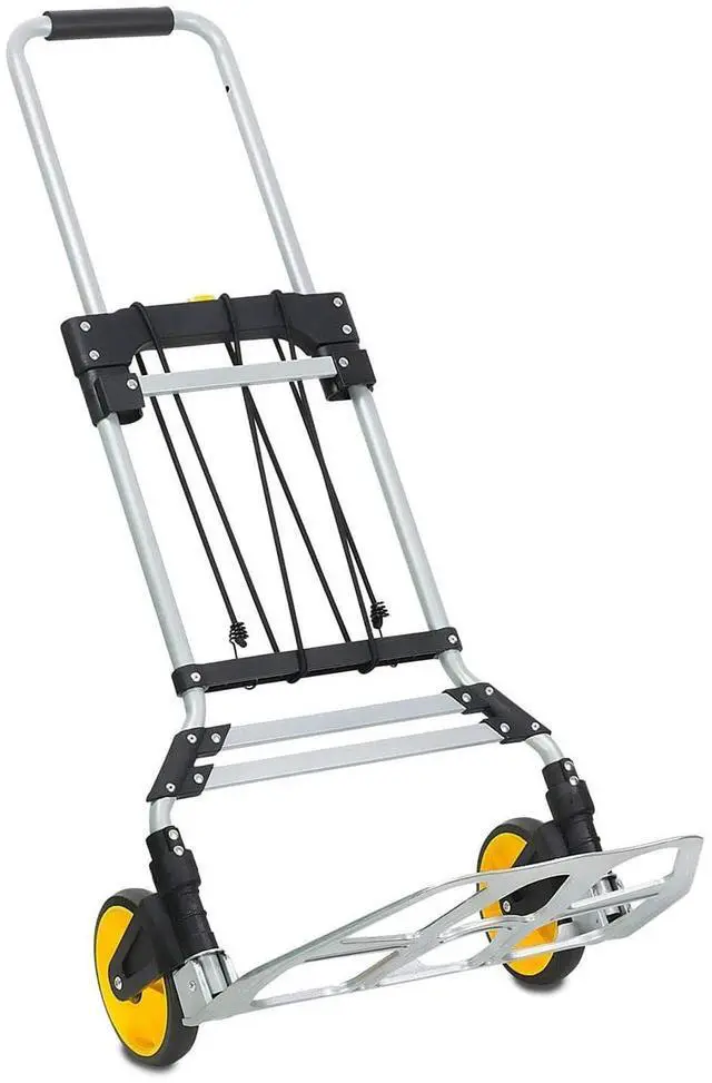 The MI-902 folding hand truck and dolly will help save your back and carry things around. This versatile cart is perfect for use at home, the office, travel, or shopping. The 7" diameter rugged wheels make it easy to balance and move heavy objects. Has a 264 lb. carrying capacity. The trolley rolls well on any hard surface as well as on carpets. The hand truck folds down to a couple of inches thick for easy storage, as well, the wheels and nose fold in and handle retracts. The handgrip is covered with soft rubber foam for comfort and added grip strength. Made from rust-proof aluminum frame and rubber wheels. A bungee cord is included to help secure items.