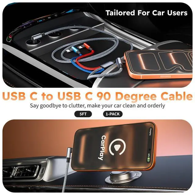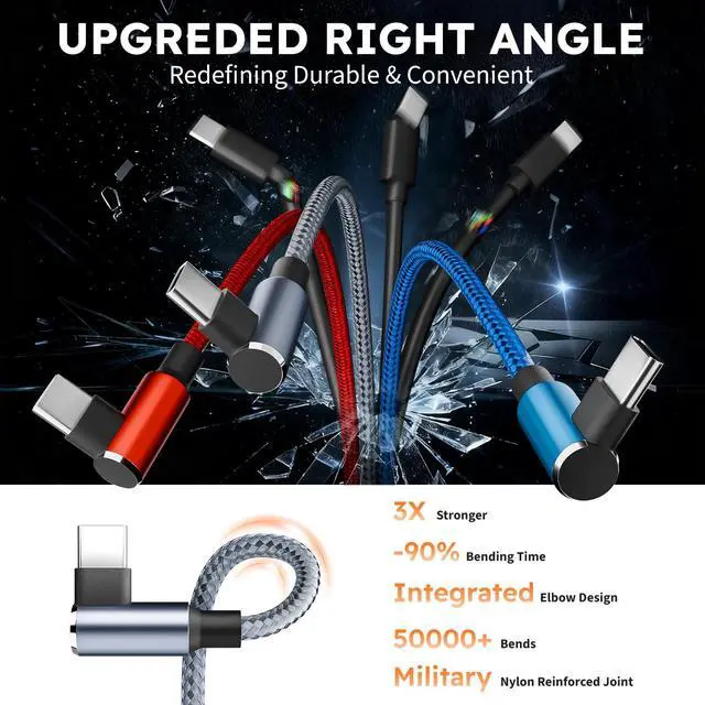 UPGRADED 10X QUALITY:This Type c braided usb c cable features a reinforced 90°angled connector with a strengthened joint for extra protection against bends and breaks.Lasts 10x longer than ordinary Type C Multi charging cable.Designed for life on the road, the unique right-angle connector lies flat against your dashboard or seatsType c to type c cable keeps your controls accessible and prevents clumsy cable clutter, perfect for long trips or ferrying passengers.