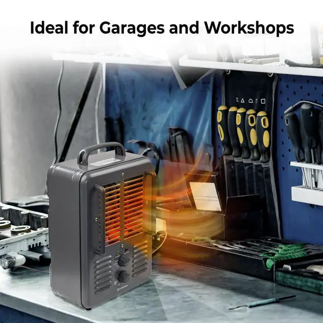 Safety is of utmost importance with this portable utility heater. It features a tip-over switch that automatically shuts off the heater if it accidentally falls or gets knocked over, preventing potential hazards. Enjoy a cozy and peace of mind heating solution for your garage space.