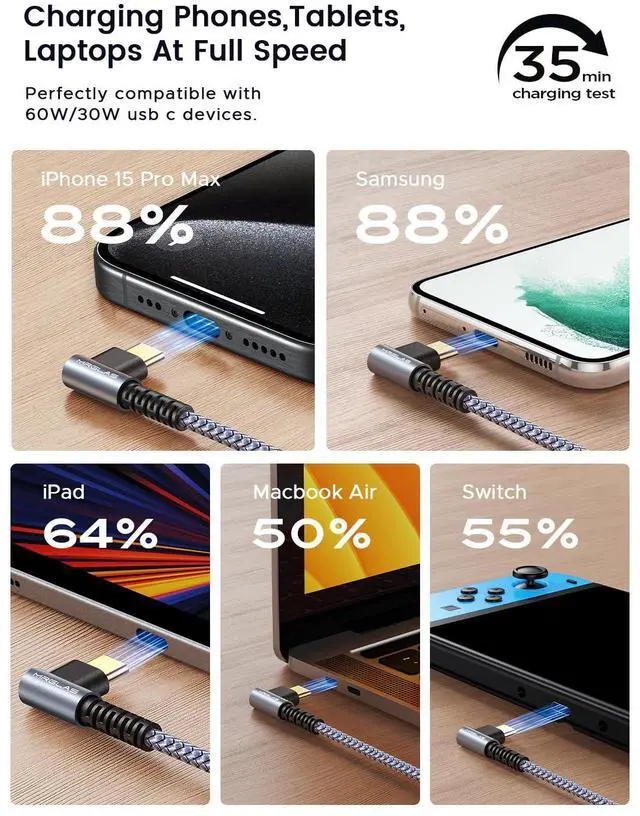 ![Alt view image 4 of 7 - USB C to USB C Cable 60W 3.2A [2-Pack, 6.6+6.6FT] Type C Charger Fast Charging Cable Right Angle Gold-Plated Nylon Braided Cord for iPhone 16 Pro Max 15 Plus Samsung S25 S24 S23 iPad MacBook](https://c1.neweggimages.com/productimage/nb640/C691D26041904PVDQD0.jpg)