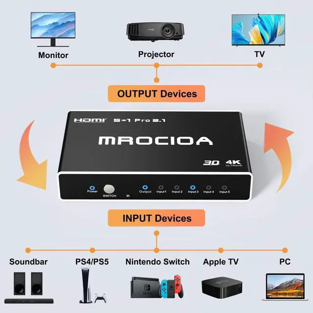 8K 60HZ hdmi ARC switch This is a well-made HDMI 2.1 switch with 5 HDMI inputs and 1 output. Just connect it to HDMI 2.1 port on your TV or monitor, you can use it to connect up to 5 independent HDMI devices, such as PS5, XBOX Series X. Support ARC, currently only Input1 port can use ARC to stream audio from TV to soundbar, plug and play