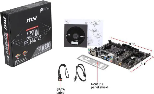 MSI A320M PRO-M2 V2 Desktop Motherboard - AMD Chipset - Socket AM4 - 32 GB DDR4 SDRAM Maximum RAM - UDIMM, DIMM - 2 x Memory Slots - Gigabit Ethernet - 4 x USB 3.1 Port - HDMI - DVI - 4 x SATA InterfacesChipset Manufacturer: AMDTotal Processor Supported: 1Processor Socket: Socket AM4Processor Supported: A-SeriesProcessor Supported: AthlonProcessor Supported: Athlon X4Processor Supported: Ryzen 3Processor Supported: Ryzen 5Processor Supported: Ryzen 7Number of Memory Slots: 2Memory Form Factor: UDIMMMemory Form Factor: DIMMMaximum Memory: 32 GBMemory Speed Supported: 2.40 GHzMemory Speed Supported: 3.20 GHz (O.C.)Memory Speed Supported: 1.87 GHzMemory Speed Supported: 2.13 GHzMemory Speed Supported: 2.67 GHz (O.C.)Memory Speed Supported: 2.93 GHz (O.C.)Memory Technology: DDR4 SDRAMController Type: Serial ATA/600RAID Supported: YesRAID Levels: 10RAID Levels: 1RAID Levels: 0Onboard Video: CPU Dependent VideoAudio Channels: 7.1Gigabit Ethernet: YesNumber of Total Expansion Slots: 3Total Number of PCI Express Slots: 3Number of PCI Express x1 Slots: 2Number of PCI Express x16 Slots: 1Total Number of USB Ports: 6Number of USB 3.1 Ports: 4VGA: YesHDMI: YesDVI: YesNumber of SATA Interfaces: 4Number of M.2 Interfaces: 1Total Number of Onboard USB Ports: 6Number of Onboard USB 3.1 Ports: 2Form Factor: Micro ATXWidth: 9.6Depth: 8.1"Country of Origin: ChinaLimited Warranty: 3 Year"