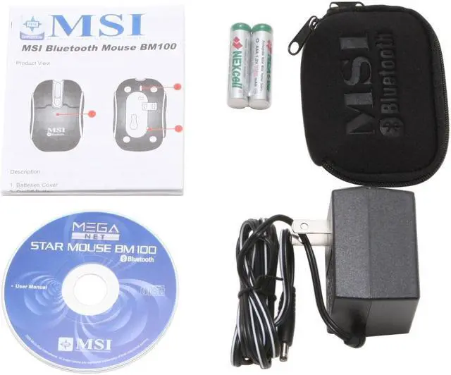 | Package Contents | BM100 Bluetooth Mouse User Manual Driver Disk 2 AA Batteries Power adapter MSI Mouse Bag |