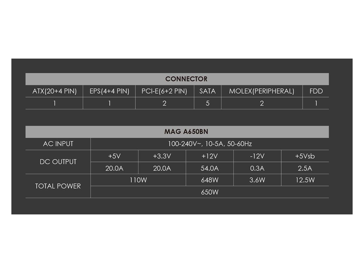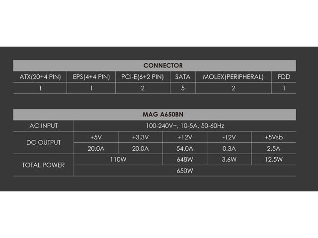 MSI MAG A650BN, Non-Modular Compact 650W Power Supply, 80+ Bronze, Low-Noise Fan, Active PFC Design, 5 Year Warranty