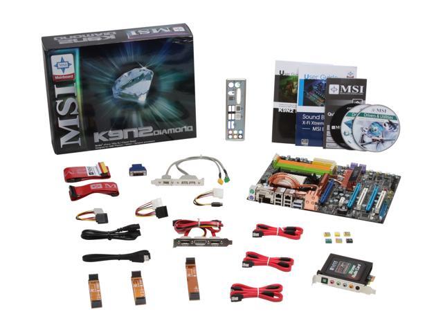 | Package Contents | K9N2 Diamond Driver Disk User Manual Rear I/O Panel Shield IDE/PATA Cable FDD Cable SATA Cable 4-pin to SATA Power Cable eSATA Cable & Power Cord eSATA Bracket SLI Bridge Audio Card IEEE 1394 & USB Bracket VGA Adapter |