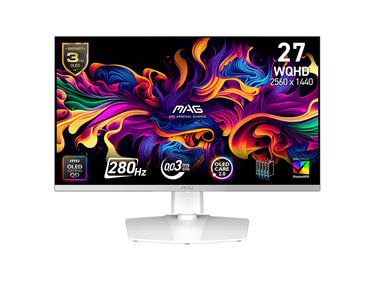 MSI 27" QHD 2K 1440P 280Hz with FreeSync Premium Pro & G-Sync Compatible 0.03ms HDR400 USB-C White OLED Gaming Computer Monitor with Height Adjustable, Swivel, Pivot & Tilt stand MAG272QPW QD-OLED X28
