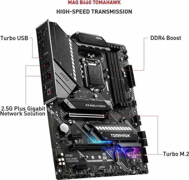 | Features | Supports 10th Gen Intel Core / Pentium Celeron processors for LGA 1200 socket Supports DDR4 Memory, up to 2933MHz (Max.) Premium Thermal Solution: Extended Heatsink Design and M.2 Shield Frozr are built for high performance system and non-stop works Lightning USB 20G: Powered by ASmedia 3241 USB 3.2 Gen2x2 controller, offering never before seen USB speeds up to 20Gb/s with USB Type-C Latest Network Solution: Onboard 2.5G LAN plus Gigabit LAN deliver the best online experience without lag Turbo M.2: Running at PCI-E Gen3 x4 maximizes performance for NVMe based SSDs Audio Boost: Reward your ears with studio grade sound quality Multi-GPU: With Steel armor PCI-E slots. Supports 2-Way AMD Crossfire |