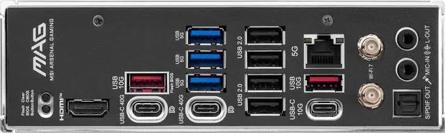 1 x Flash BIOS button 1 x Clear CMOS button 1 x HDMI port 1 x USB 10Gbps Type-A (From CPU) 1 x USB 10Gbps Type-A (From X870 chipset) 1 x USB 10Gbps Type-C (From X870 chipset) 2 x USB 40Gbps Type-C (From ASM4242) 3 x USB 5Gbps Type-A (From GL3523) 4 x USB 2.0 Type-A ports (From GL850) 1 x 5Gbps LAN (RJ45) port 2 x Wi-Fi Antenna connectors 2 x audio jacks 1 x Optical S/PDIF Out connector