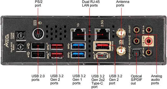 | Back I/O Ports | 1 x Clear CMOS Button 1 x Flash BIOS Button 1 x PS/2 Keyboard/Mouse Combo 2 x USB 2.0/1.1 3 x USB 3.2 Gen 2 Type-A 1 x USB 3.2 Gen 2x2 Type-C 2 x USB 3.2 Gen 1 Type-A 2 x LAN (RJ45) 1 x Optical S/PDIF Out 5 x Audio Jacks Wi-Fi /Bluetooth Antenna Connectors |