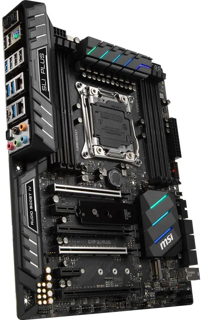 Build an Intel Core X-series desktop computer with the X299 SLI Plus LGA 2066 ATX Motherboard from MSI. The motherboard comes with an LGA 2066 socket and an Intel X299 chipset to support an Intel Core X-series CPU. It is well suited for video-editing and digital-creation environments by offering eight DDR4 DIMM slots and four PCIe 3.0 x16 slots. For storage options, it has eight SATA connectors for accommodating SATA-based optical and storage drives. PCIe-based SSDs can be installed into its two M.2 slots and one U.2 connector and configured in a RAID array with MSI's M.2 Genie for fast read and write speeds.