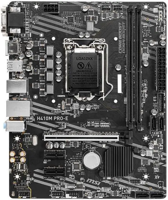 Supported CPU Supports 10th Gen Intel Core and Pentium Gold/ Celeron processors for LGA 1200 socket Chipset Intel H410 Chipset Form Factor Mirco-ATX Form Factor 9.3 in. x 7.5 in. ( 23.6 cm x 19.0 cm) Expansion Slots PCI 1x PCIe 3.0 x16 slot (From CPU) 1x PCIe 3.0 x1 slot (From PCH) Memory Type Non-ECC, Un-Buffered Memory Slots 2x DDR4 memory slots Supported Memory Intel