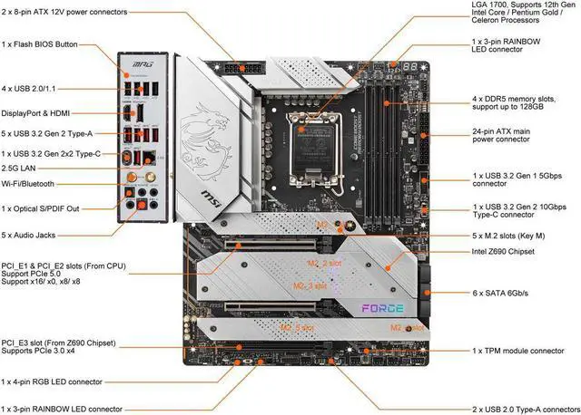 Intel Z690 Supports 12th Gen Intel Core Processors (LGA1700) Supports DDR5 Heavy plated mosfet heatsink with heat-pipe/ high quality 7W/mk mosfet thermal pads/ extra choke thermal pads/ onboard M. 2 Shield Frozr The latest wireless solutions supports 6GHz spectrum, MU-MIMO and BSS color techology, deliverying speeds up to 2400MBps The latest PCIe 5.0 solution with up to 128GB/s bandwith for maximum transfer speed With premium layout and fully digital power design to support more cores and provide better performance Advanced technology to deliver pure data signals for the best performance, stability and compatibility Dedicated LGA1700 mounting bracket is required