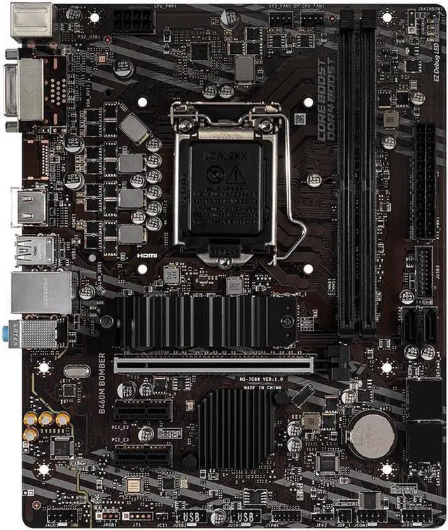 The MSI B460M BOMBER is a reliable micro-ATX motherboard designed for 10th Gen Intel processors. It supports up to 64GB of DDR4 memory, offers fast storage with an M. 2 slot and six SATA ports, and includes PCIe 3.0 slots for graphics and expansion cards.